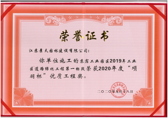 近日,由江蘇省蘇州宿遷工業(yè)園區(qū)開發(fā)有限公司建設(shè)管理的蘇宿工業(yè)園區(qū)2019年工業(yè)區(qū)道路綠化工程第一標(biāo)段榮獲2020年度“項羽杯”優(yōu)質(zhì)工程獎。