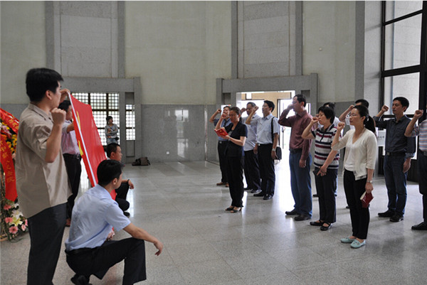 在周恩來紀(jì)念館總理雕像前,駱敏、周原敬獻(xiàn)了花籃,園區(qū)各局辦、開發(fā)公司黨員負(fù)責(zé)同志面對(duì)鮮紅的黨旗,莊嚴(yán)地舉起右拳齊聲宣誓,重溫了入黨誓詞。